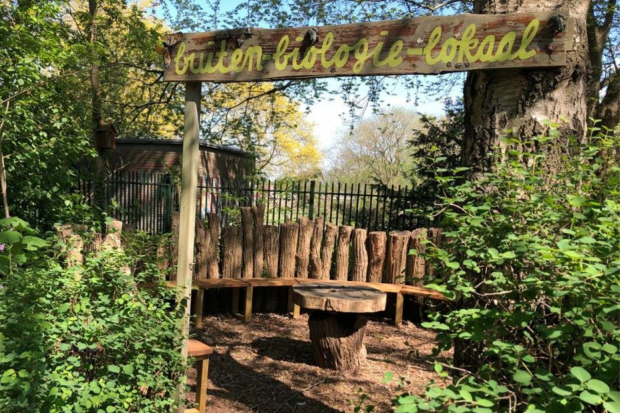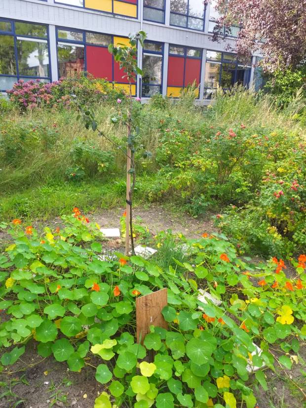 Moestuin, wildeweide, vlindertuin, bospaadjes, vijver, paddenpoel, boomhut, waterpomp, klimboom. We hebben het hier niet over een natuurgebied maar over onze eigen super groene School Oost.